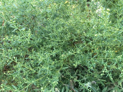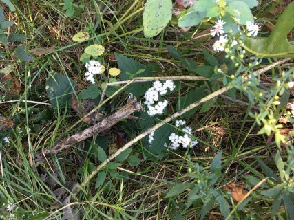 We had a real surprise this morning. As I was looking to see what happened to our compass plant (it just didn’t do too well this year), I noticed some bright white densely clumped flowers among the tall grasses. I had seen these before–white snakeroot!