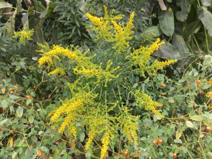 Finally, around mid-September, there were signs of both–extremely tiny buds on one plant, and faint yellow flowers on the other. The yellow one is, of course, goldenrod, and what a spectacular plant it is! It has produced a spectacular array of tiny yellow flowers, often looking like Nature’s own fireworks display.