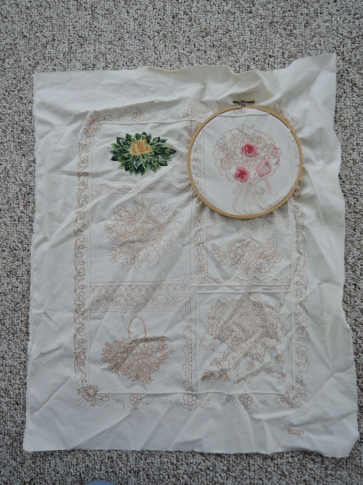 I remember thinking how beautiful the picture on the package looked–six colorful bouquets of flowers surrounded by an intricately patterned frame. This was a real embroidery project! Now, almost 20 years later, I’ve liberated it from its plastic grocery bag (poor thing, doesn’t even have a proper storage basket) and am continuing the craft. Actually, the grocery bag performed quite well–keeping it clean and intact over years of neglect. As you can see, it’s just a bit wrinkly. But the hunt is on for a beautiful new sewing basket!