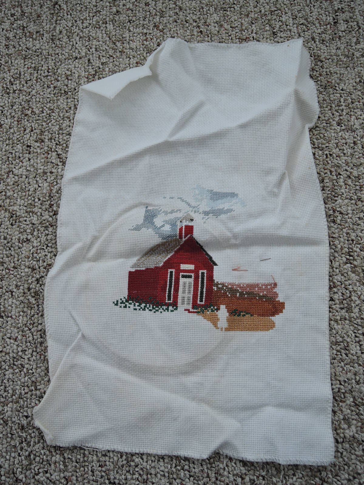 I think I enjoy embroidery for the same reason that I like coloring books and painting–it’s a chance to bring a picture or a scene to life. What begins as a black and white (or tan and white), lifeless sketch is slowly transformed into a warm, colorful picture that is almost alive with depth and texture. When I was younger, I always imagined I was bringing the coloring book scenes to life. I also had a cross stitch project way back then, and it, too, has survived the many years spent stuffed in a plastic bag. For some reason, cross stitch doesn’t “speak to me” the way that embroidery does. Maybe it’s the linear flatness that doesn’t appeal; maybe it’s the incessant counting. At any rate, I think this is about as far as this project will go: