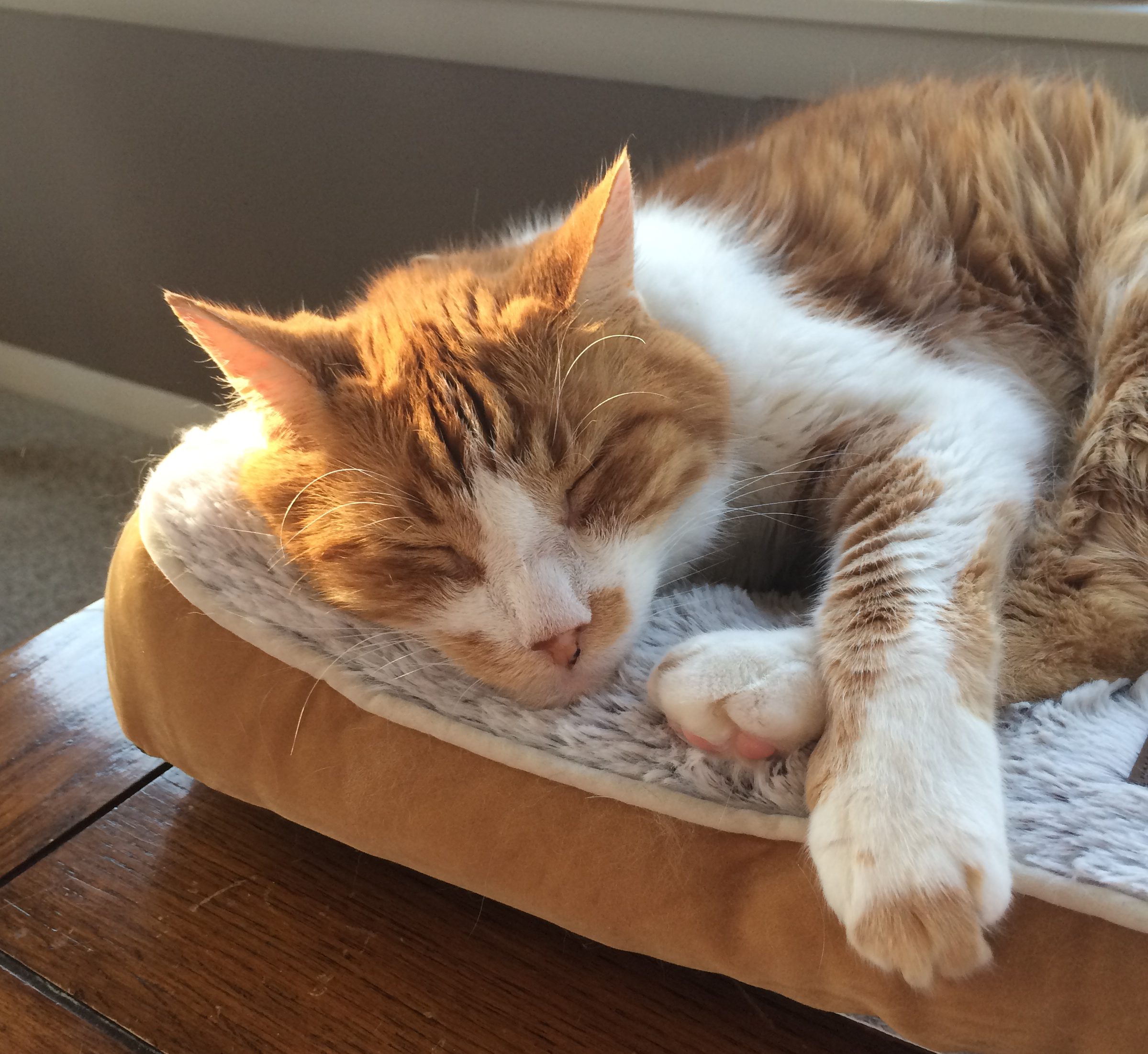 Coffee helps. Stumbling to the kitchen, being careful not to trip over Samson (who, like all cats, must lead the way, a bare half-step in front), I start the pot brewing. The grumbly sounds of the water on its journey through the mechanism are comforting–never fear…hot caffeine is on the way. While this is in process, I get fresh food and half-and-half for Samson; I’m sure the sounds of the dishes clinking and the refrigerator door opening are comforting to him, as well. Soon, the big blue mug is full of coffee and I can move to the sunroom to greet the morning.