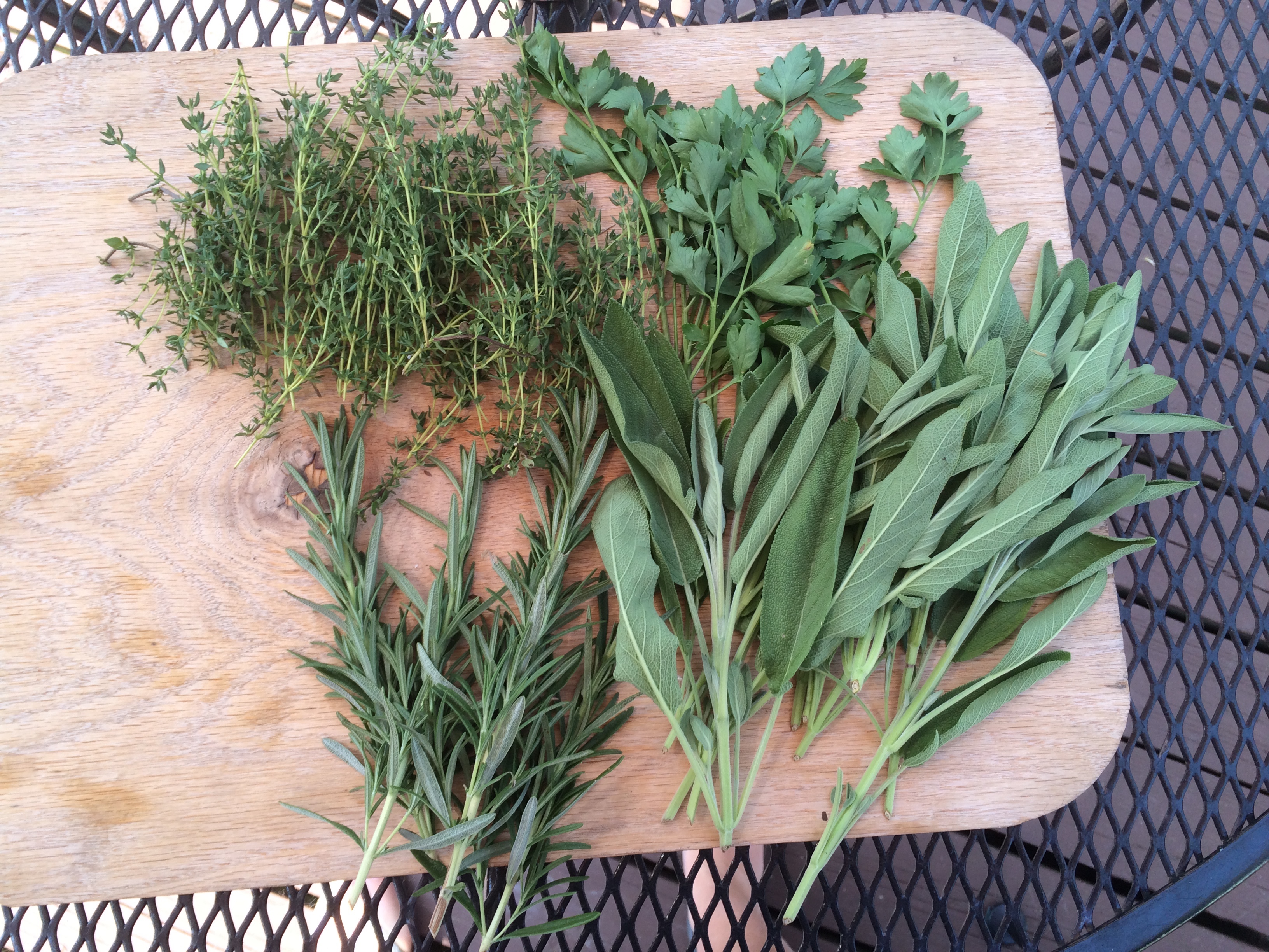 Meanwhile, over in the herb garden, things are finally taking off, too. There was a “battle of the slugs” back in May, and many seedlings were lost. However, the larger plantings survived and are now looking as they should. Here’s today’s harvest: