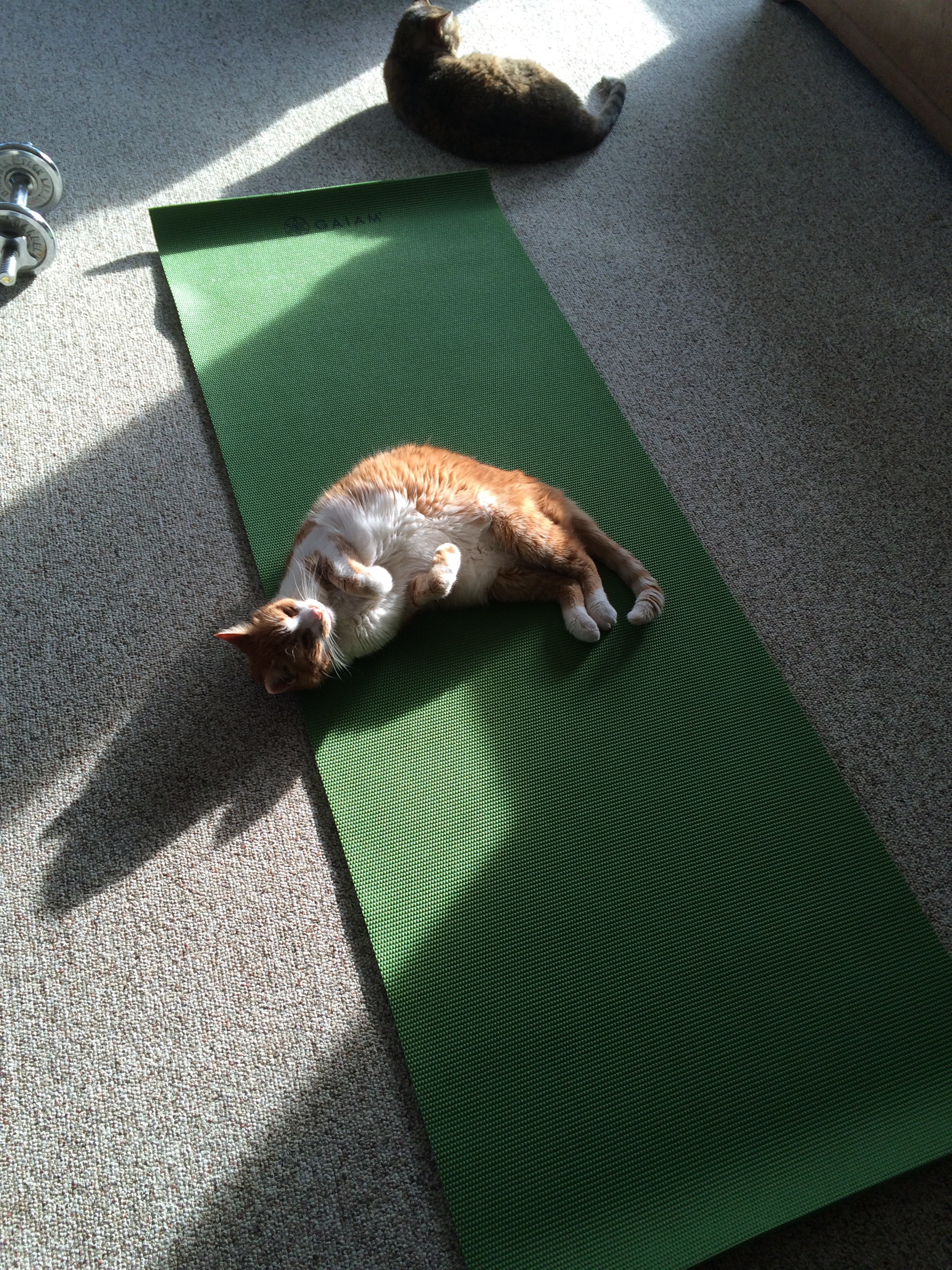 There’s really no typical Saturday around here, but the arrival of the weekend does present an opportunity for activities and mind frames that just aren’t possible during the work week. For starters, the driving question changes from “What do I have to do today?” to “What would I like to do today?”–a significant shift. The pace of life slows a bit; tasks become more mindful, more meaningful. Years ago, I began attending yoga classes with my sister on Saturday mornings. Although never what anyone would call consistent, since then I’ve tried to keep doing yoga as much as I can, adding that and daily morning meditation into my weekly routine. I’m terrible at hauling myself out of bed early in the morning, so I can manage meditation before I head off to work, but a full yoga session usually needs to wait until evening or the weekend. Doing yoga at home instead of driving to a class helps, although sometimes there are still some logistical problems…