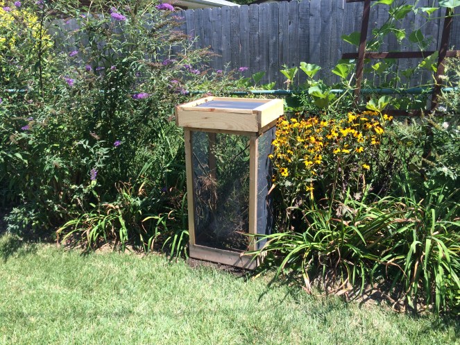 It’s fascinating to watch these guys go through their life cycle… eating and growing and eating and growing. However, we’ve found that when they reach a certain size, the birds get them and/or they wander off in search of a chrysalis site. So here’s what I asked Joe to build…