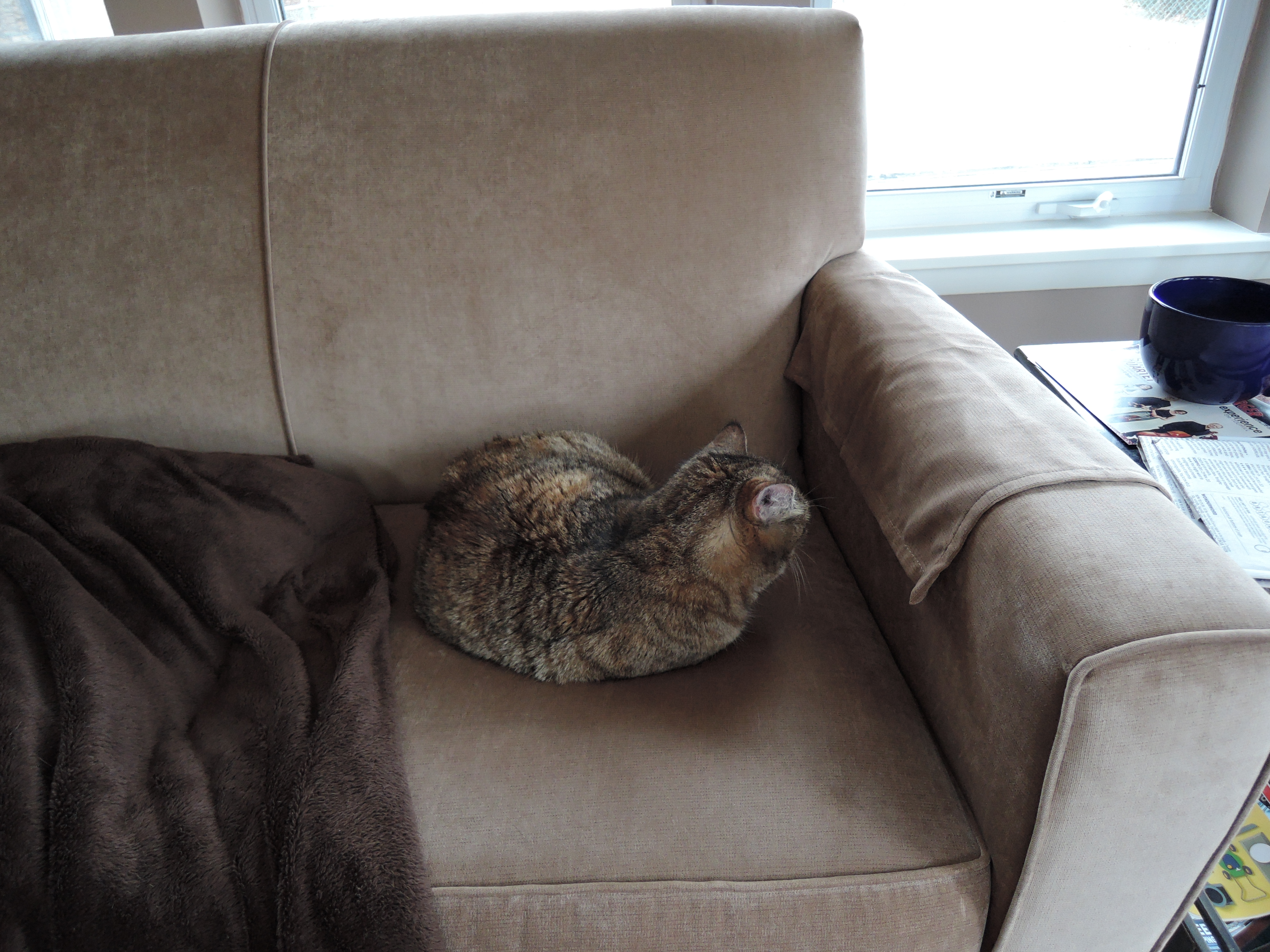Not content with the fuzzy blanket that I graciously share with her, she took my spot. “Carpe Cushion” is her motto. She pretended to not hear me when I told her she had to move, but I could see her right ear taking it all in. She didn’t move.