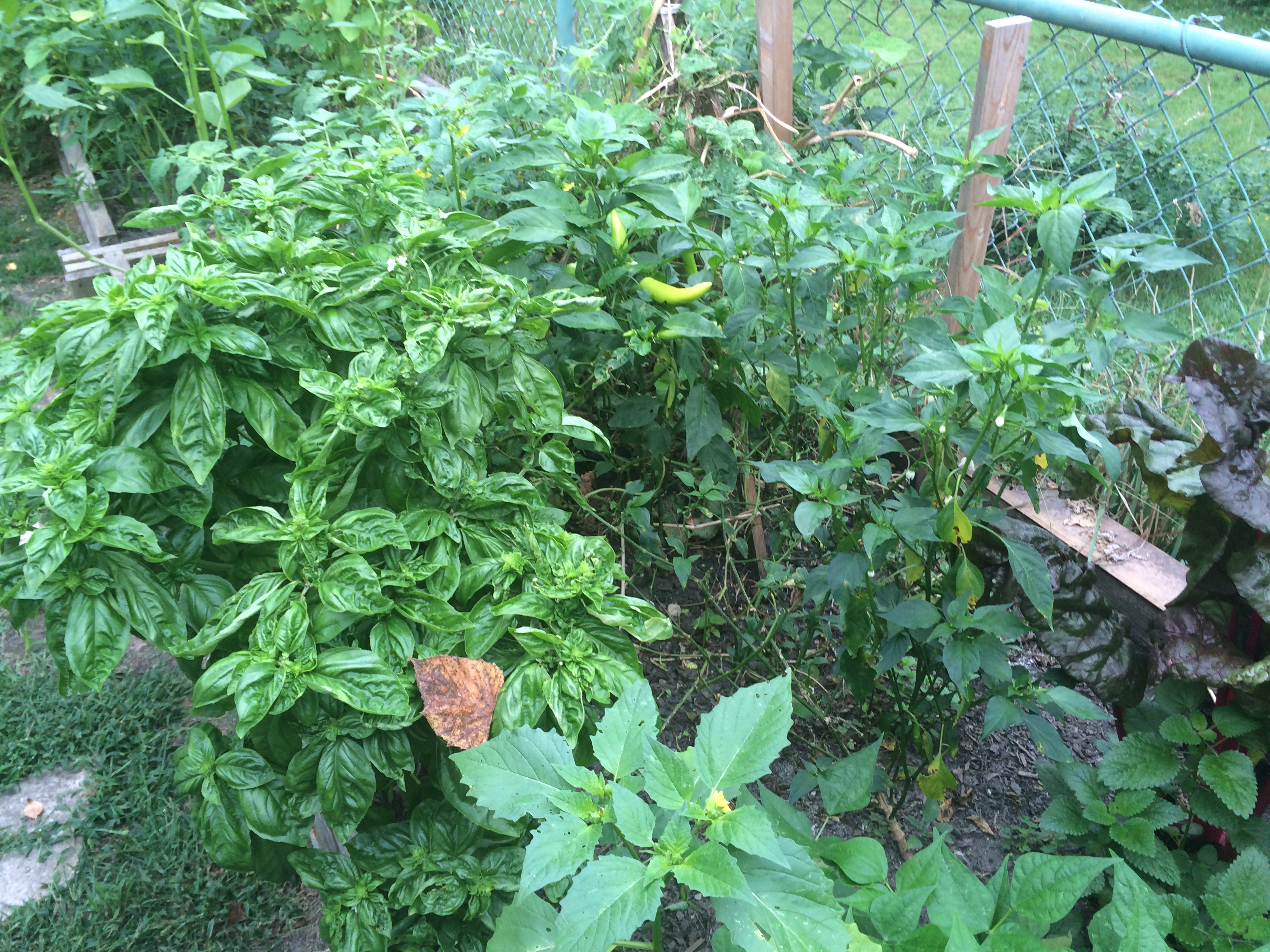 By this point in the summer, our cardinals are raising their last set of young. I can hear them chittering and cheeping each morning in the neighbor’s arbor vitae, which seems to be their favorite nesting place. The parents make good use of our nearby vegetable garden, scouring the tomatoes, tomatillos, and eggplants for caterpillars to take back to the nest.